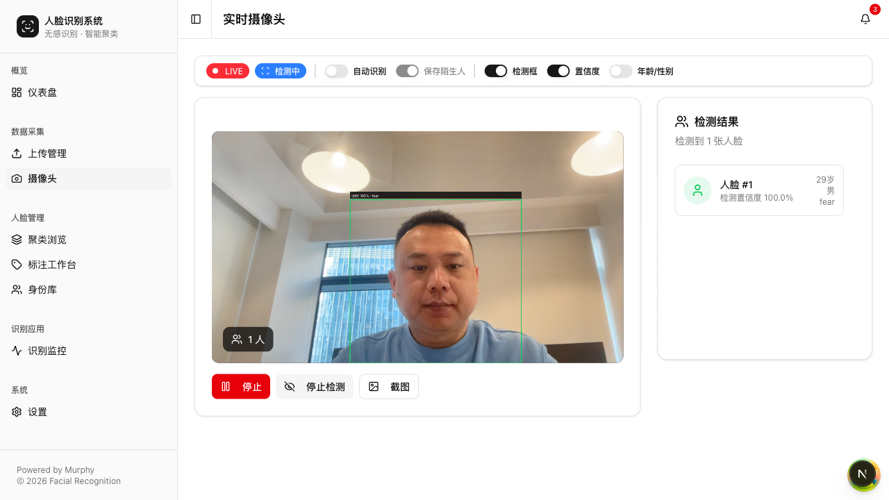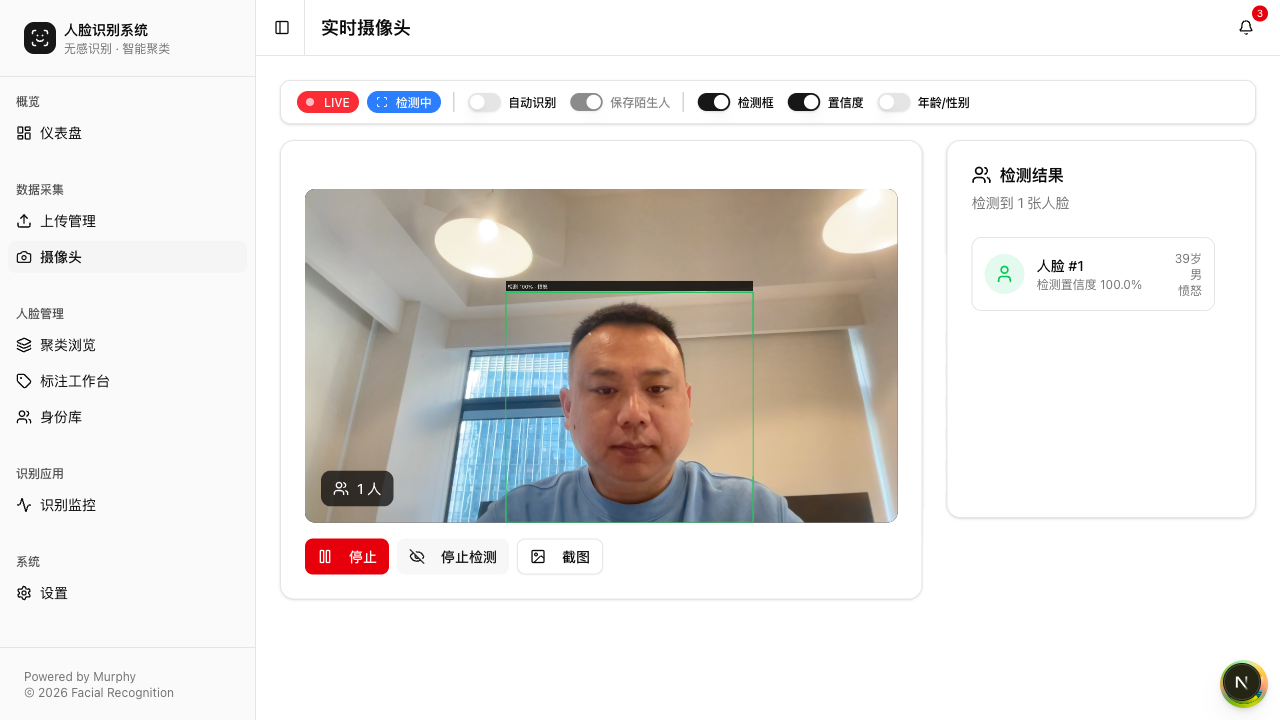 基于 WebRTC 的实时视频流处理,毫秒级人脸检测与跟踪。实时显示检测框、年龄性别、表情等丰富信息,支持多人同时检测。