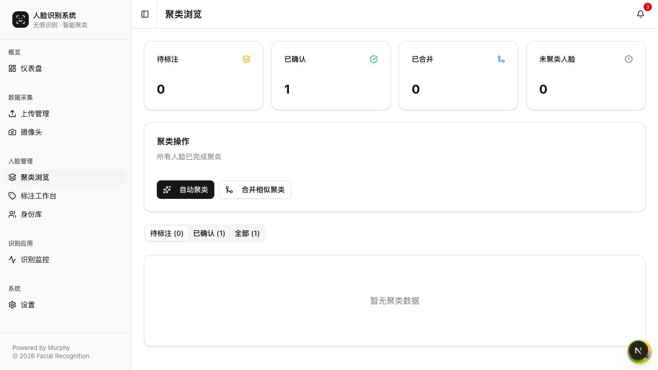 基于 pgvector 的高效向量相似度检索,自动将相似人脸聚类分组。支持手动合并、拆分聚类,以及批量确认和删除操作。