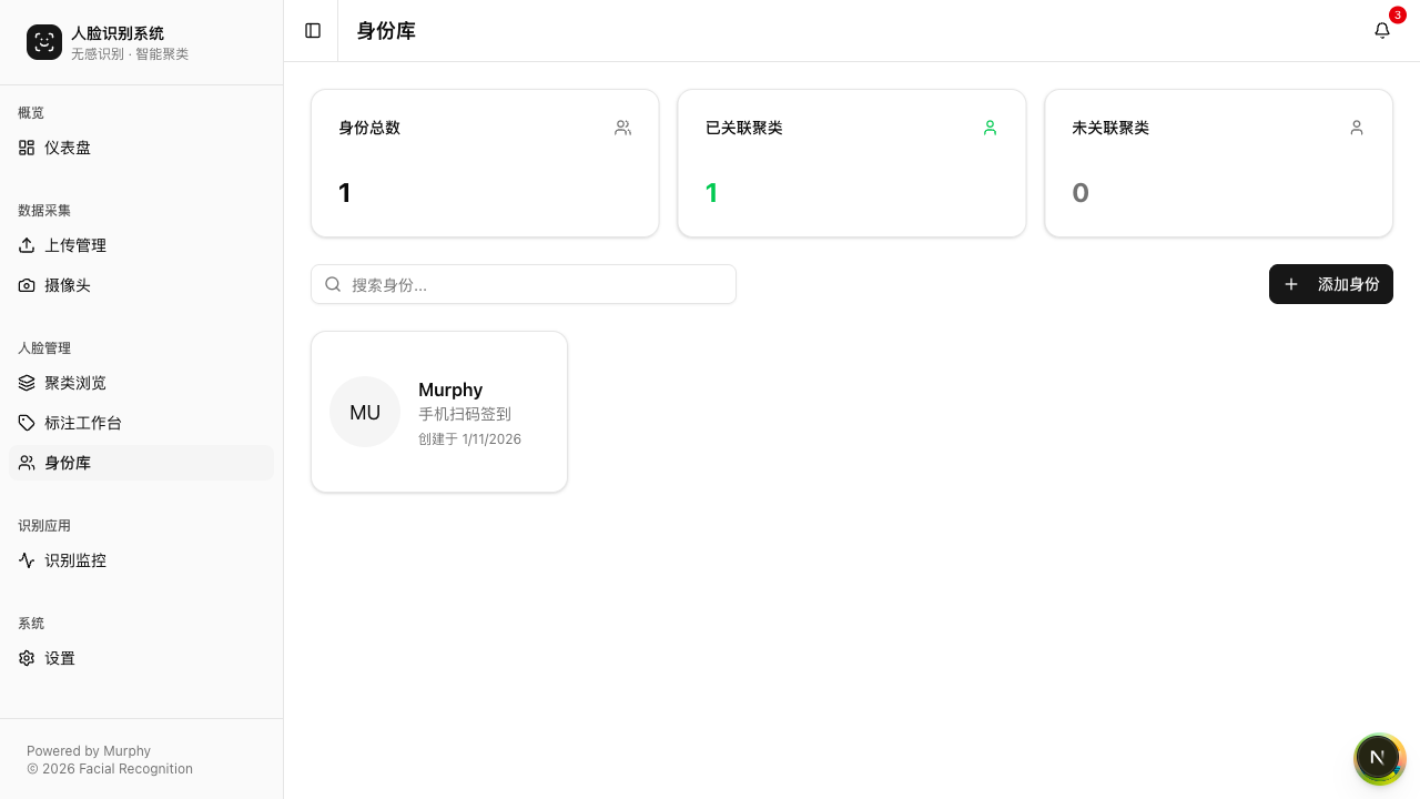 建立人员身份库,管理已确认的身份信息。查看每个身份关联的人脸数据,支持编辑、删除等操作。