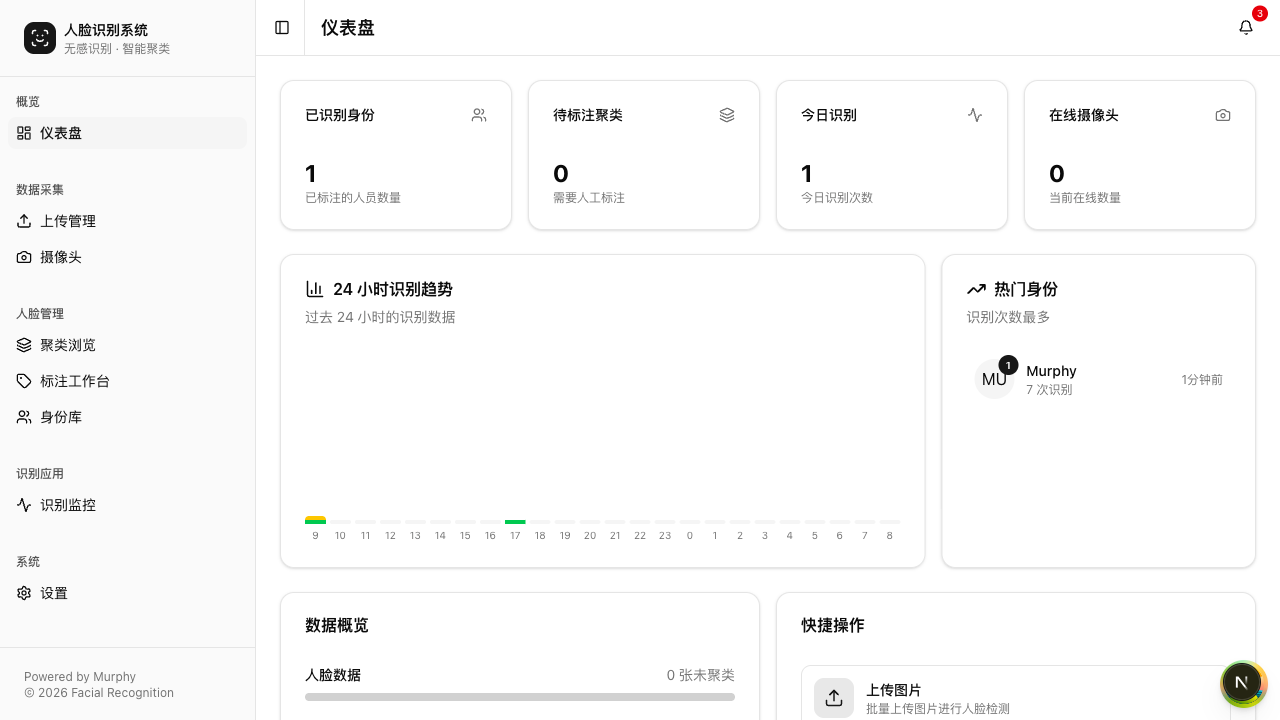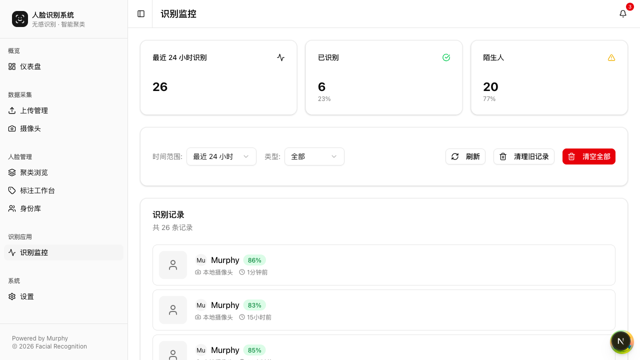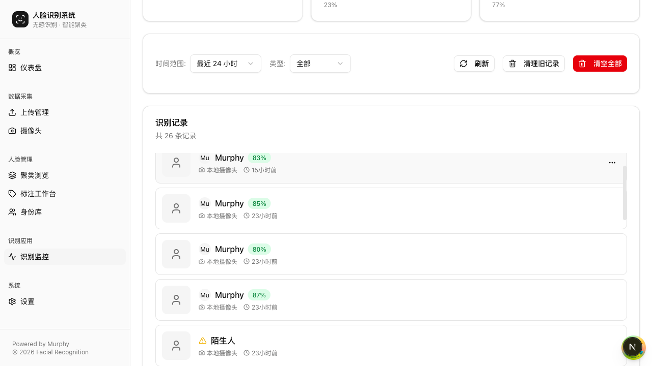 实时识别事件流、24小时识别趋势图、热门身份排行榜。一目了然的统计数据,全面掌控系统运行状态。